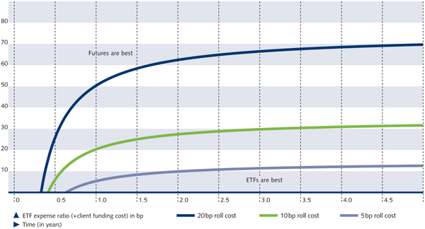 Eurex: So if futures are best for short-term exposure, and ETFs usually best for long-term exposure, is it possible to calculate the “break even” point where an investor should be indifferent between futures or ETFs?
