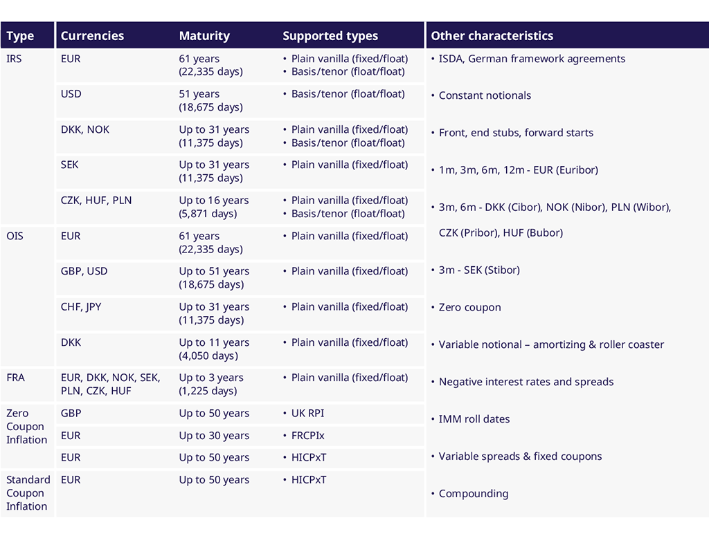 We offer clearing for OTC Interest Rate Swaps as well as Inflation Swaps. By clearing both through EurexOTC Clear, clients can benefit from significant margin offsets where there are correlated risk reductions.