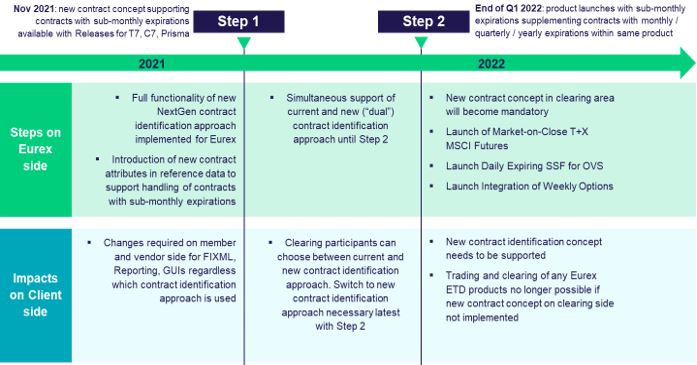 To support all market participants with this change to a new contract identification concept, Eurex has planned a transition period that allows for participants to choose their timeline for switching from the current to the new contract identification concept. This transition period will start with the introduction of the T7, C7 and Prisma Releases in November 2021 (Step 1) and last until end of March 2022 (Step 2).