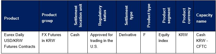 Effective 26 July 2021, Eurex Clearing will offer clearing services for Eurex Daily USD/KRW Futures introduced at Eurex Deutschland. The corresponding amendments to the legal framework of Eurex Clearing will also become effective on 26 July 2021.