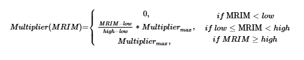 The size dependence is achieved by parametrizing the multiplier through linear interpolation between the low and high MRIM thresholds, ensuring that: