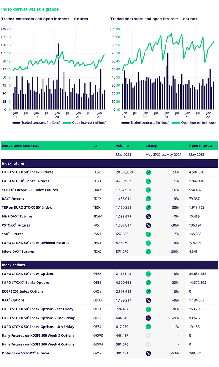As macroeconomics takes center stage, investors are reaching for their 1970s and 80s playbooks and the word ‘stagflation’ appears more often among research notes. However, for me, this would represent a rather benign scenario. I see more downside risks. How do central banks tame inflation which is of the external ‘cost-push’ type rather than ‘demand-pull,’ without tripping up the fragile post-pandemic recovery back into a more severe recession? This uncertainty keeps the demand for portfolio hedging high. We see strong volumes across our familiar EURO STOXX 50 and STOXX® 600, Banks sector, DAX, SMI and KOSPI benchmark index futures and options, a continuation of recent trends. We also saw a new record for a non-roll month in MSCI derivatives, where the World contract is increasingly the dominant product. On the options, the EM contract took over the lead from World in open interest terms. In addition, MSCI China futures grew to EUR 2.7bn open interest, the highest level since 2018, and ACWI reached EUR 3.3bn EUR, up from 1bn at the end of 2021. The FTSE segment had the most active two-week period since launch, with 66.5k lots traded at the start of the month with 90% of FTSE 100 TRF trades hedged with the respective vanilla FTSE 100 index futures at Eurex. The combined open interest crossed the 100,000 lots mark, an impressive EUR 9.2bn equivalent.