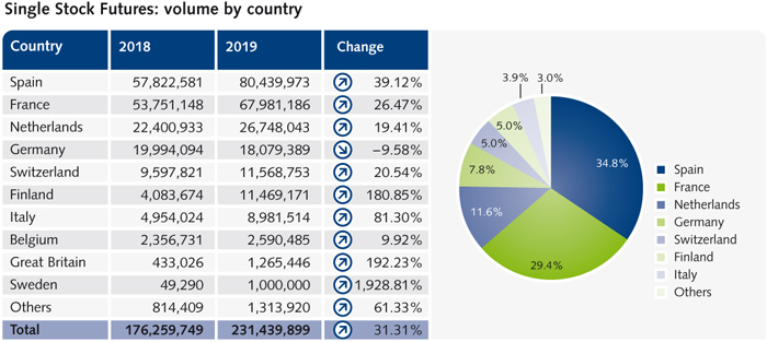 In 2019, we expanded the Eurex Single Stock Futures offering to more than 845 names, by far the largest offering of SSFs on one exchange. This offering includes 63 SSFs with physical delivery, including all the EURO STOXX 50® Index components. Overall, 2019 was a very good year for SSF volume. The average traded contracts per trade increased from 12,400 to 15,600 while volumes increased by 31 percent (176 million contracts vs 232 million contracts). Spanish SSFs form the largest segment, followed by the French SSFs. The biggest YoY gain was made in the Swedish segment though, recording a 1929 percent increase (from 49,000 contracts to 1 million).