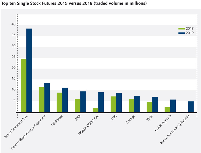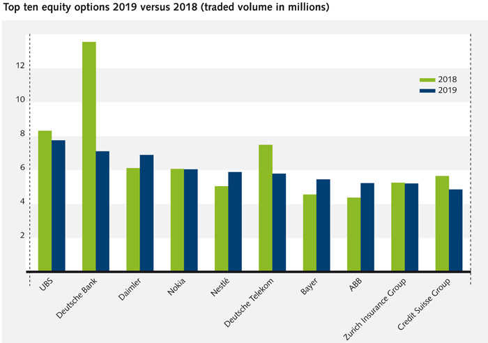 The end of the decade turned out to be one of the better years for equity returns. Bullish sentiment and declining volatility usually translate into lower volumes in equity options. New overall records were therefore not established. Some country segments, notably Swiss, Dutch and French equity options showed considerable growth rates though. The Swiss segment grew by 7.6% percent compared to 2018 and UBS, Nestlé, ABB, Zurich and Credit Suisse are now in the top ten of largest single equity option contracts on Eurex. The Dutch segment grew by 15.1% percent while French equity options grew by 6.1% percent.