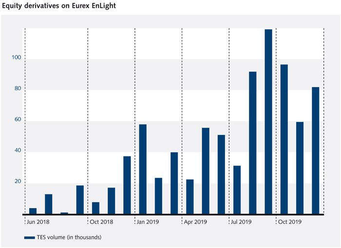 Eurex EnLight, the RfQ platform that combines the advantages of electronic price formation with the core functionalities of voice trading, was rolled out to all equity and equity index options in May 2019 after a successful initial roll-out to the Swiss market in 2018. Since the 2018 launch, more than 800,000 contracts were traded in single stock options, with an overall number of RfQs of 1,425 and 735 Deals until the end of 2019. Those are very encouraging results, backed by positive user feedback. More functionalities will be added to EnLight in 2020, such as the Smart RfQ functionality, further helping to connect buyers and sellers on Eurex.