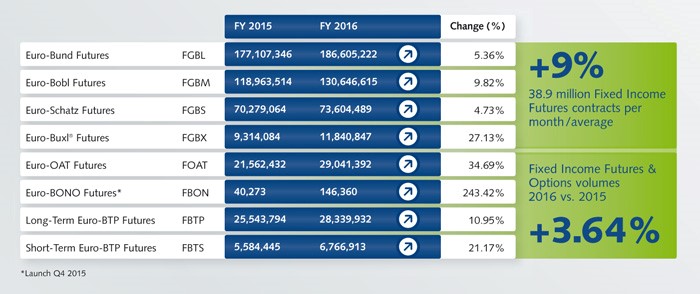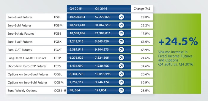 In the final quarter of 2016 Fixed Income markets enjoyed a strong performance that was largely driven by increased event and geopolitical risks. This helped drive better than expected realized volatility in the underlying markets which supported Eurex’s core and periphery products.