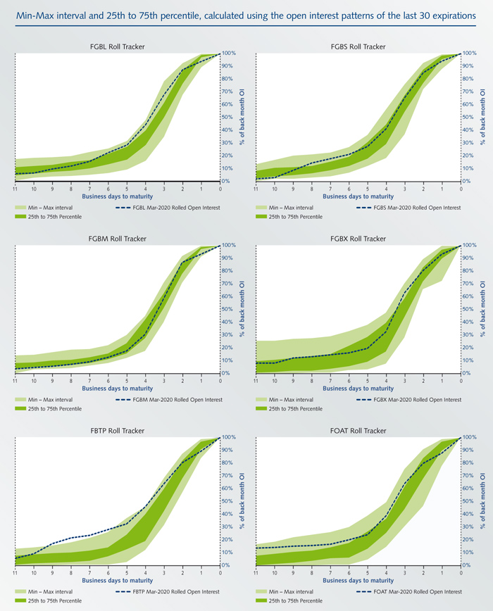 In March, the roll of fixed income futures proceeded smoothly amid the market turbulence. German bond futures rolled to the June expiry in line with previous quarters. Further, Italian long-BTP futures open positions rolled to the June expiry earlier than previous quarters, with more than 60% of the open interest rolled to the back contract three days before expiry.