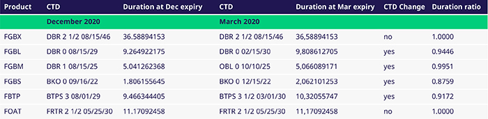 The duration of the new CTDs is greater than the previous CTD. Therefore, when rolling to the next expiry, the futures exposure needed to hedge the same amount of risk was lower. This was reflected in the duration ratios between the two bonds in the underlying deliverable basket; to get the same exposure of 1,000 December 2020 Bund contracts, you only needed 944 March 2021 contracts.