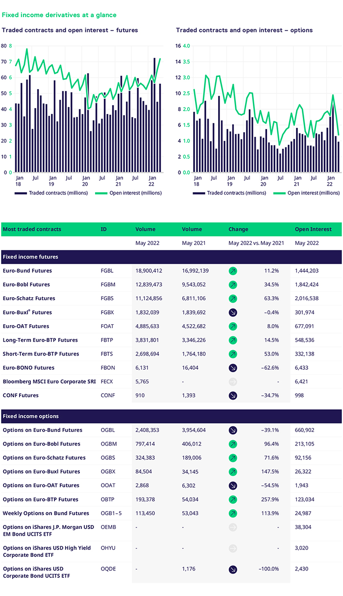 As we moved into May, the macroeconomic backdrop was still supportive of our portfolio. Central banks across the globe are grappling with increasingly elevated levels of inflation at a time when voices are growing ever louder on recessionary concerns. The Fed is now debating how it best manages a 'soft or softer' landing for the U.S. economy. Considering the rhetoric around the factors mentioned, options volumes were well supported across the portfolio in May. The German segment outperformed except for the 10y, where Bund options saw a decline versus May 21, with c.2.4m contracts trading versus c.3.9m in May last year. On the other hand, weekly options on Bunds saw a significant increase in volumes of 113.9%, which continued into June. The belly of the curve and the front end saw a significant percentage increase, with Bobl volumes 96.4% and Schatz 71.6% higher versus 2021. Bobl and Schatz segments traded 797k and 324k contracts, respectively. The long end of the curve outperformed with an increase of 147.5%, rading 84.5k contracts.
