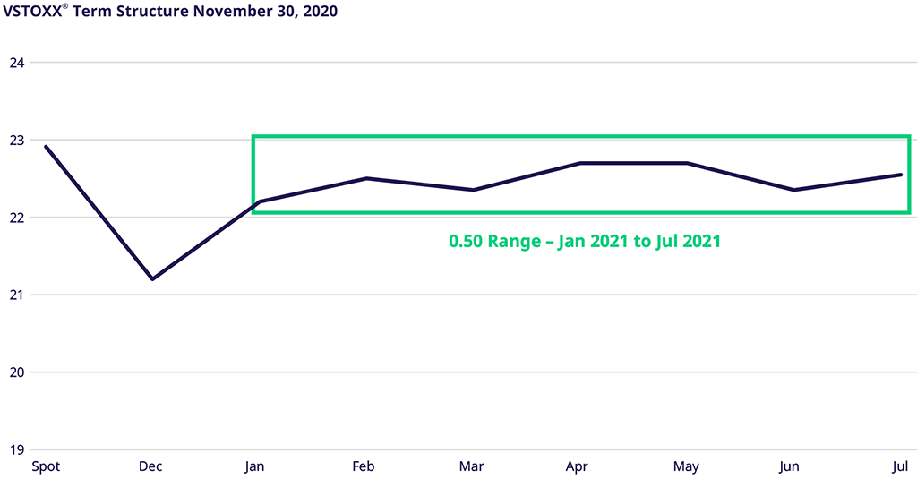 One interesting characteristic of the VSTOXX® curve is how flat the shape is over the first seven months of 2021. Based on November 30 closing prices, the range of settlement prices for the seven active 2021 contracts is a historically narrow 0.50.