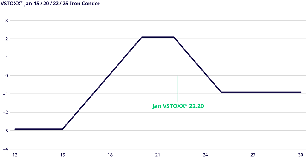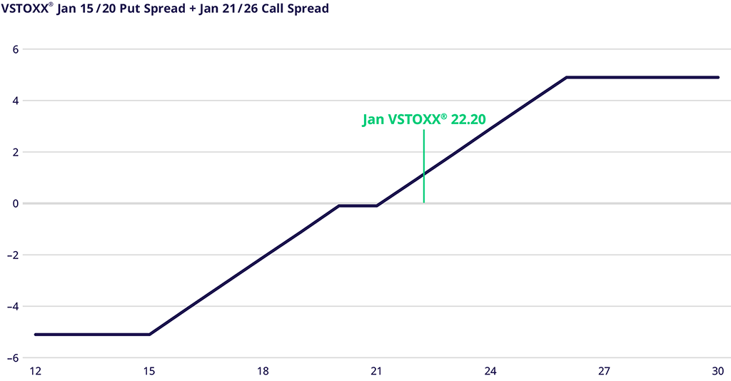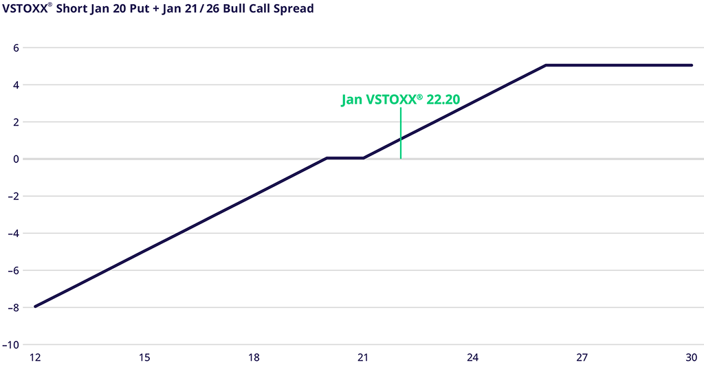 Finally, if there is any concern about a quick drop in VSTOXX® or a need to cover the short put option the Jan 15 put could be purchased for 0.10 and combined with the previous trade. The result would be a combination of a VSTOXX® Jan 15 / 20 bull put spread and Jan 21 / 26 bull call spread for a net cost of 0.05.