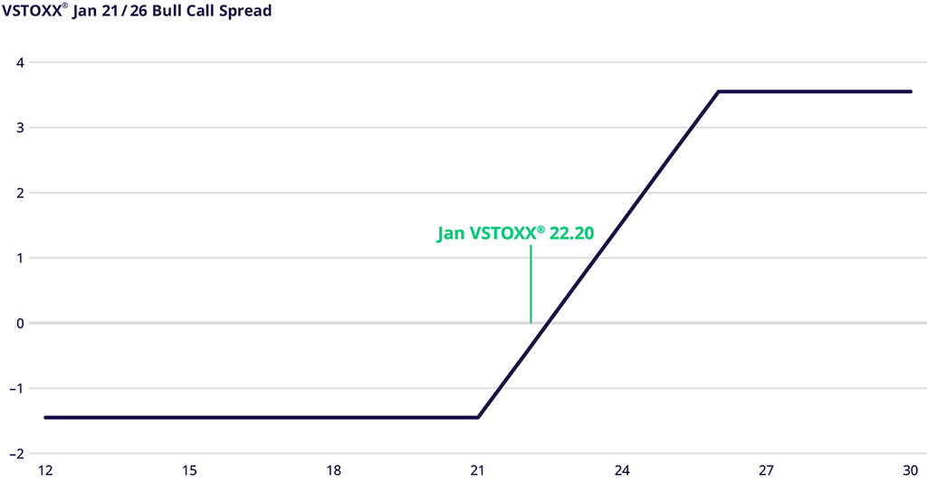 Long volatility strategies using VSTOXX® options usually have a premium cost to them, but with the VSTOXX® curve fairly flat and the futures in line with spot VSTOXX® some basic option strategies might make sense. Using the current pricing of January VSTOXX® options, the VSTOXX® Jan 21 Call can be purchased for 3.50 and the VSTOXX Jan 26 Call sold for 2.05 resulting in a net cost of 1.45. The payout at expiration appears below.