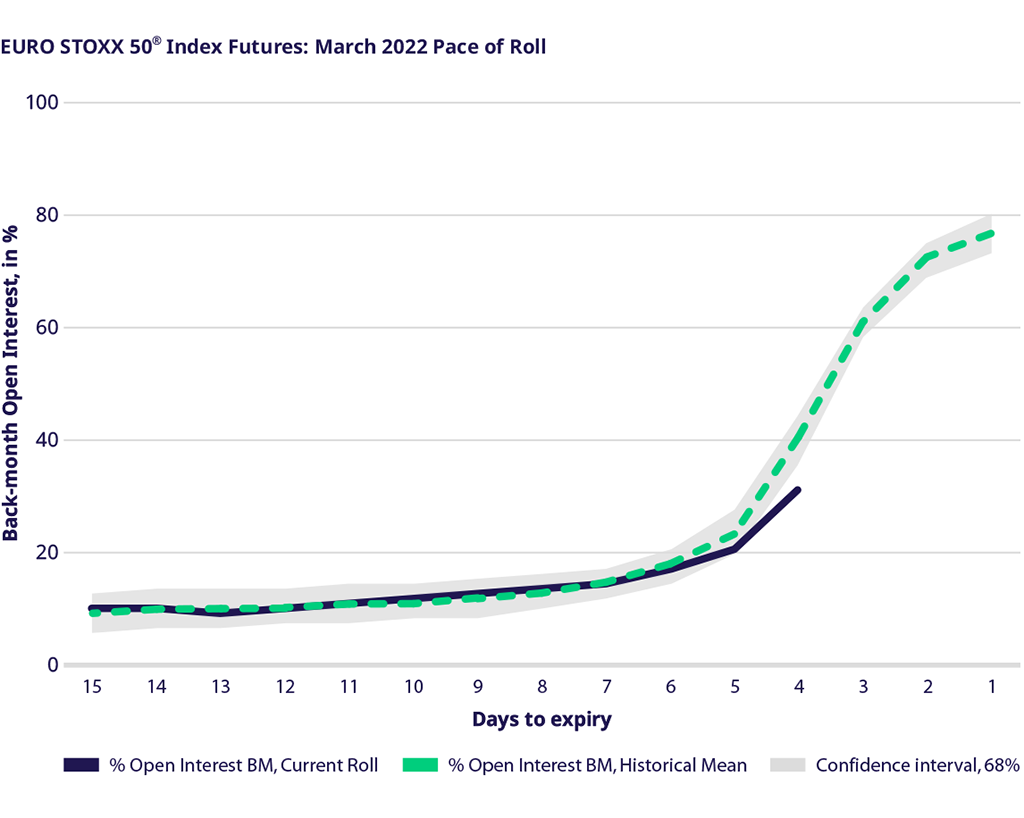 As we see from the graph above, EURO STOXX 50® Index Futures demonstrates a smooth rolling activity which tracks one to one the historical averages. It has started with almost 10% of back-month open interest 15 trading days prior to expiry and added another 11% in the first two weeks of rolling month. It is expected that members will roll another 55% of open interest into back-month expiry.
