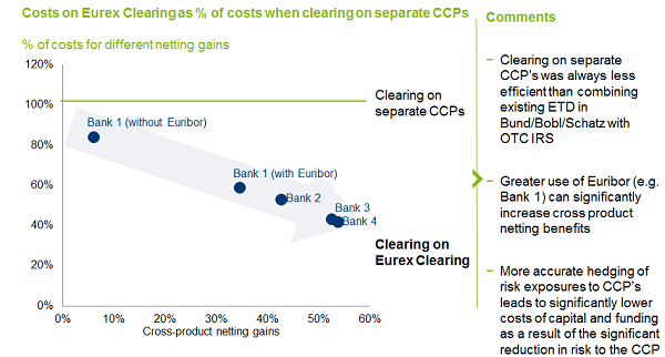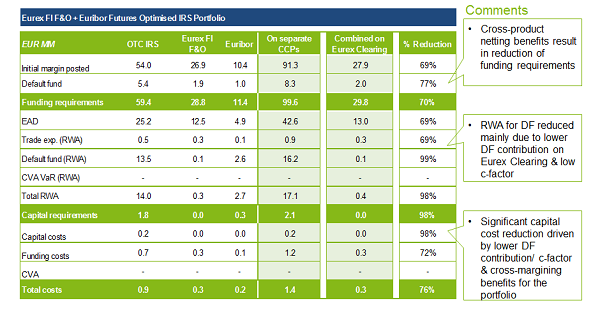 The analysis by Oliver Wyman (see below) showed that by clearing all euro-listed derivative products and OTC IRS through Eurex Clearing generated between 40 percent and 59 percent cost savings for the sell side in terms of lower initial margin requirements, lower Default Fund contributions and lower capital regulatory requirements through the netting of exposures.