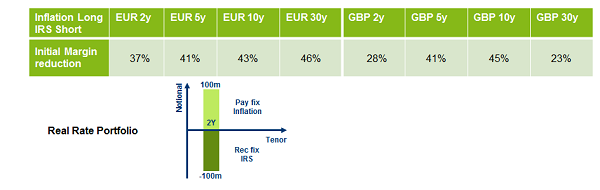 ZCIS will be cleared within the the Fixed Income Liquidation Group with OTC IRS and fixed income and money market futures and options giving the buy side and sell side alike superior portfolio margining benefits compared to a silo'd CCP IRS offering across the three asset classes of OTC IRS, ZCIS and Euro listed derivative products. Below are examples of the initial margin savings of EUR and GBP real rate portfolios of various tenors of ZCIS and OTC IRS.