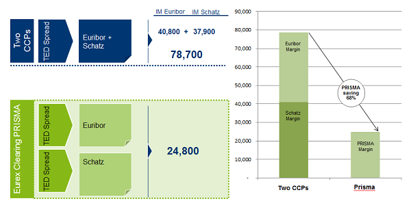 The benefits of cross margining for both the buy side and the sell side can be seen by analyzing the initial margin requirement of a relative value, DV01 neutral, EURIBOR strip versus Euro-Schatz Futures, or 'Term TED' trade. Clearing both products through Eurex Clearing and generating cross margining savings results in a 68 percent reduction in initial margin requirements compared to clearing both products on two separate CCPs.