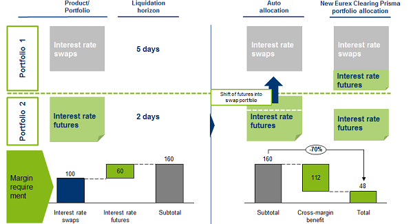 Cross margining at Eurex Clearing is provided by its innovative risk management system Eurex Clearing Prisma (Portfolio RISk MAnagement) which calculates risk and margin on a portfolio basis segmented by pre-defined Liquidation Groups that comprise closely correlated products. The default management is also aligned to products within each Liquidation Group under Eurex Clearing Prisma.