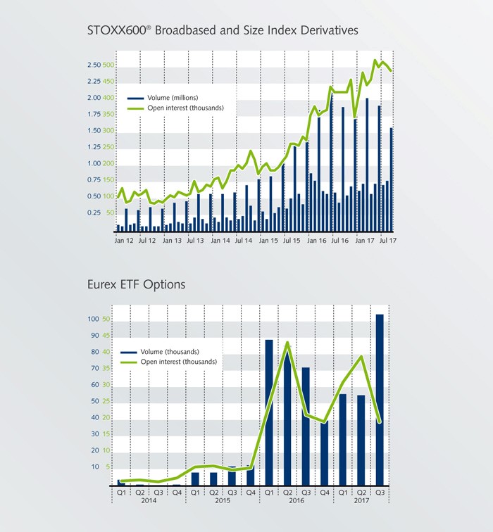 Eurex saw record volumes in the ETF options segment for the third quarter of 2017. With the newly listed and quoted options on iShares Core S&P500 (CSPX), iShares Core FTSE 100 (ISF), iShares EURO STOXX Banks 30-15 UCITS (EXX1) and iShares STOXX Europe 600 ETF (EXSA), the offering is growing and more and more investors are considering implementing option strategies on existing ETF positions via ETF options. Main volume contribution can be seen in the options on iShares EURO STOXX 50 (EUN2) and iShares DAX UCITS ETF (EXS1). Find out more about the full range of Eurex's ETF options offering or download all ETF options information in one file including information such as product codes, multiplier and vendor codes.