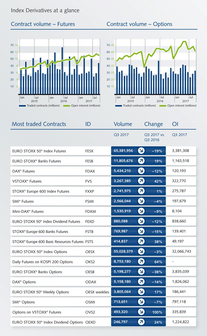 At Eurex, Q3/2017 trading volumes were at 359 million contracts, 3 percent lower than in Q3/2016 (370 million). The equity index segment alone is down by 7.41 percent, compared to the prior-year period.