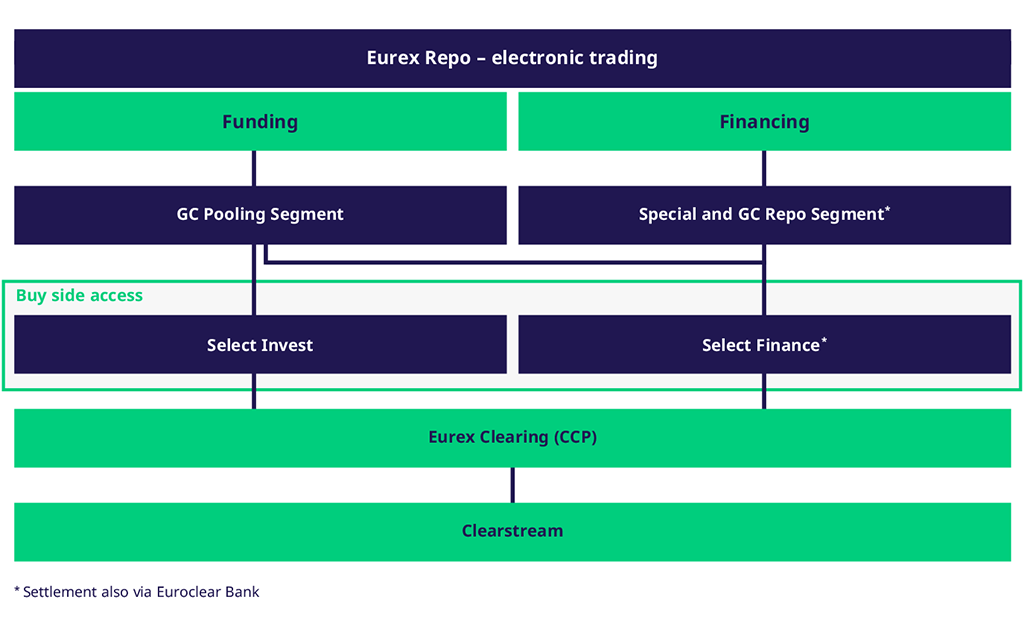 Eurex Repo and Eurex Clearing have expanded the existing, successful interbank markets to address buy-side clients. In contrast to the anonymous interbank segments, the customized buy-side trading permissions offer bilateral trading. This allows banks and their buy-side clients to continue their existing business relationships. The Select Finance trading permission provides buy-side clients such as regulated financial service companies, insurance and reinsurance undertakings, pension funds or investment funds access to the GC Pooling, Special and GC Repo segments.