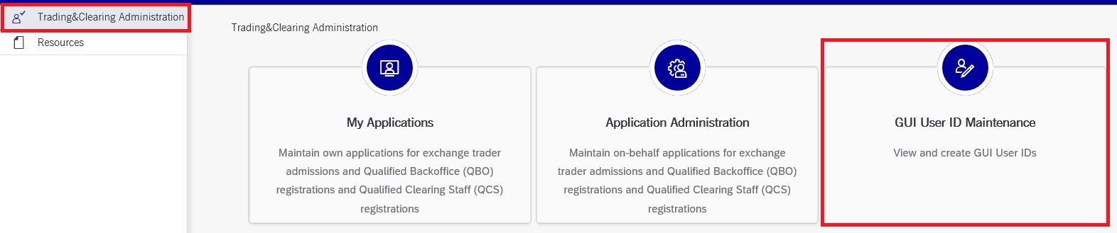 Then the User ID Maintainer has to register the User ID in the Member Section under the following path: Trading & Clearing Administration > GUI User ID Maintenance > Add GUI User ID.