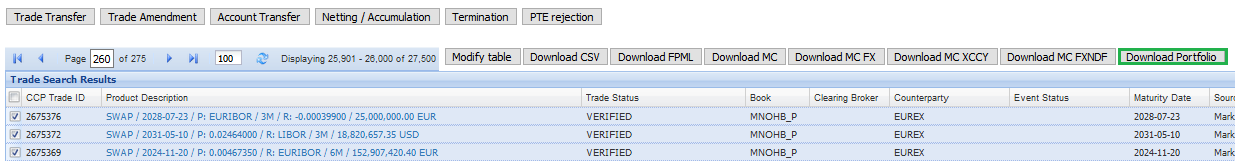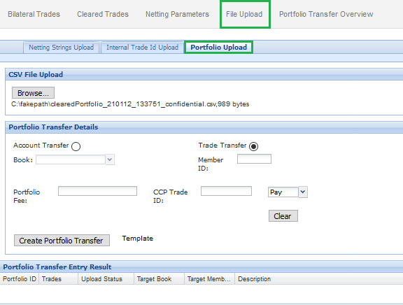 The transfer can be a transfer to a different Clearing Member (ID) (Trade Transfer) or to a different account within the same Clearing Member (ID) (Account Transfer). A portfolio transfer always terminates the existing trades and re-opens a new trade with the same attributes and a new trade id.