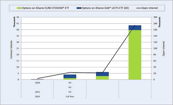 The ETF options volume traded at Eurex has steadily increased during the past months. Market makers Optiver and Susquehana ensure narrow bid/ask spreads and high liquidity. The traded volume is mainly concentrated on the two underlying instruments iShares EURO STOXX50® ETF (EUN2) and iShares DAX® UCITS ETF (EXS1). The growing attention from other European investors and the many advantages of ETF options inspire confidence that this positive trend will continue.