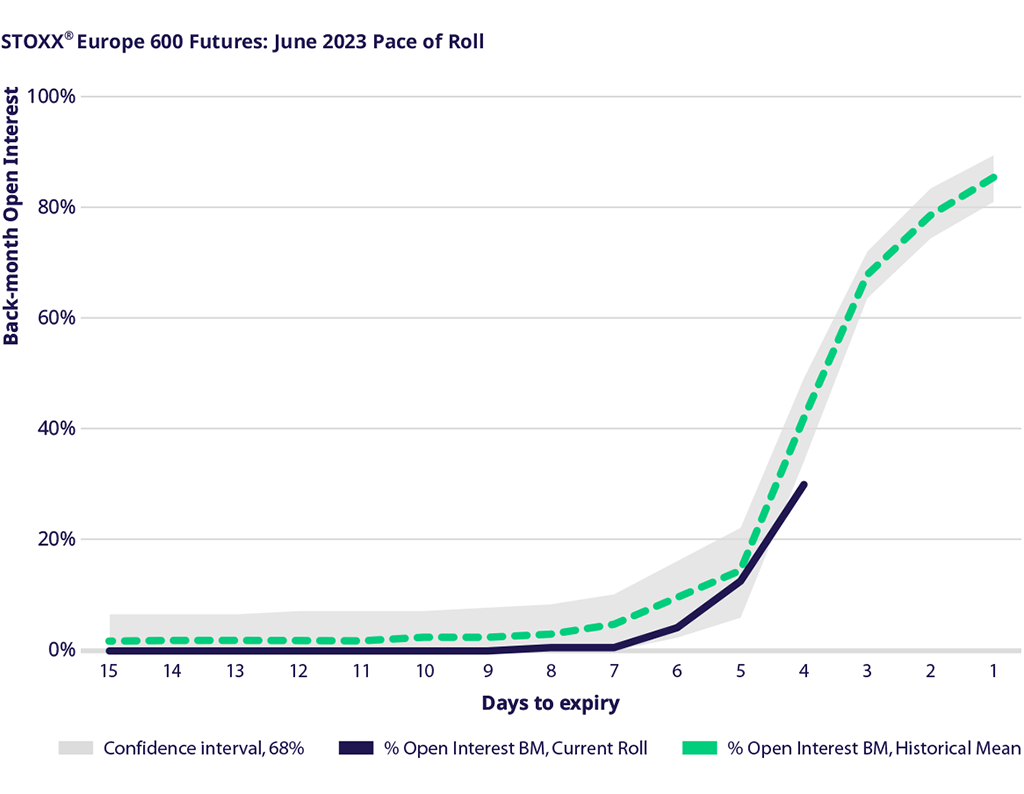 Unlike previous times, the STOXX® Europe 600 Futures roll started six trading days before the expiry. As of the beginning of this week, 30% of OI was rolled to the back month expiries, slightly lower than historical average values. We expect most of the roll activities to be done during this week.