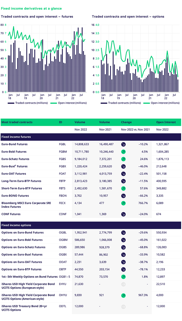 Broadly speaking, November was a challenging month for the options segment. Weekly Bund options continued to buck the trend, outperforming relative to the rest of the rates complex. Volumes were modestly 1.8% higher. The ETF options segment was November's bright light, with volumes across several of the underlying's. Emerging Market Bond ETF Options saw c21.6k contracts trade, High Yield and Corporate Bonds ETF Options saw 9.8k and 12k contracts trade, respectively. As we moved into December, the Treasury ETF has seen good volume development, which we will discuss in the review of 2022.