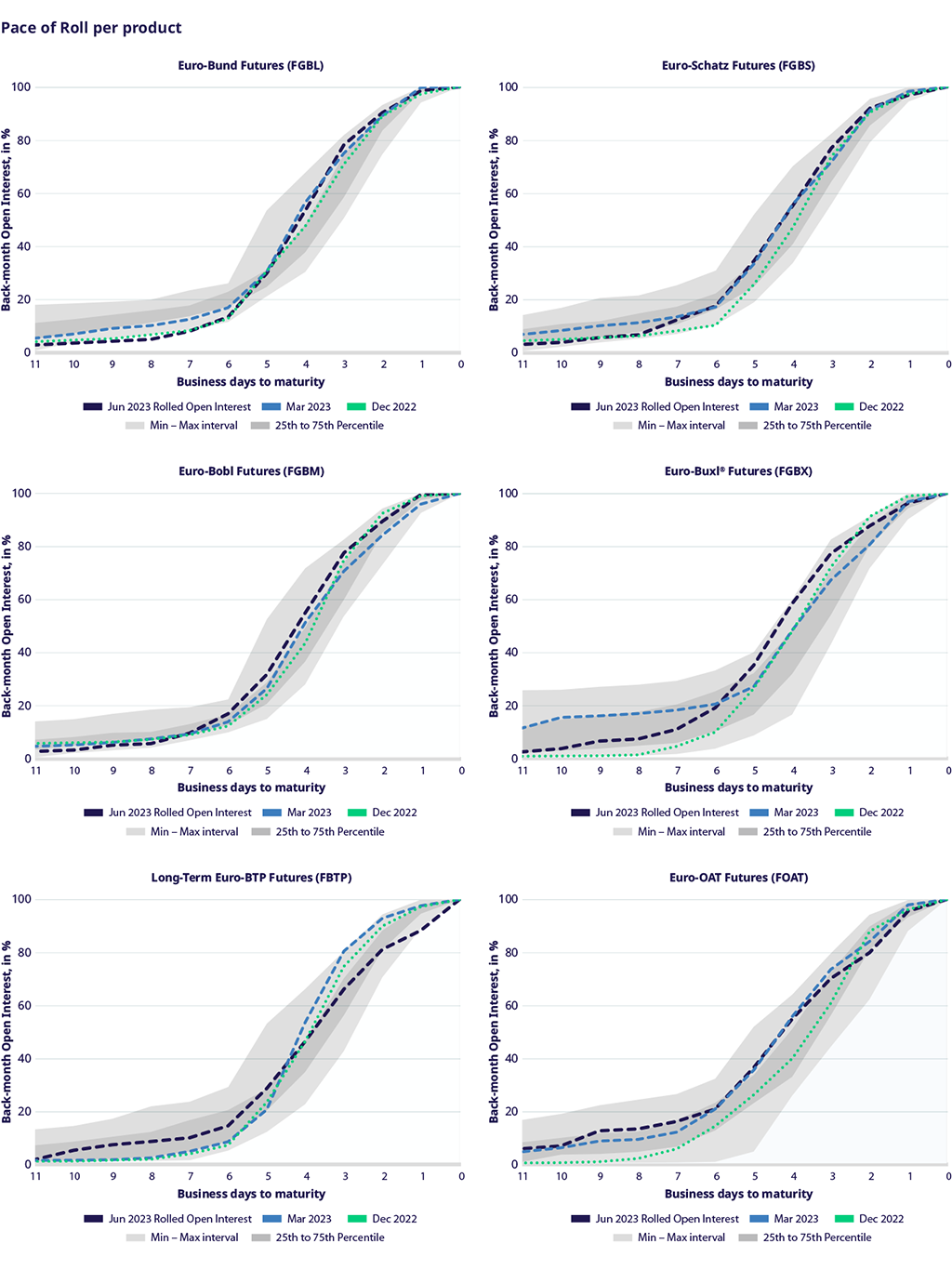 Compared to the March 2023 roll, activity for June 2023 started later to expiry. This was most prominent for Buxl futures (FGBX), where activity was lower ten days prior to the last trading day. For the other contracts, shifting open interest into the back month picked up speed only six days out, following the trend of the March 2023 roll and December 2022 roll. This is most observable in Bund (FGBL) and Schatz (Schatz).