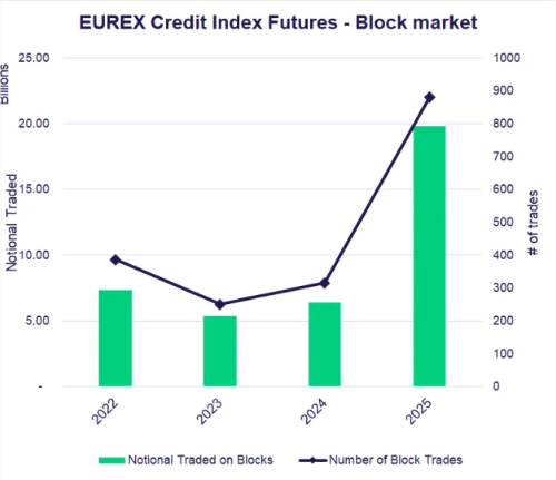 “A second important aspect is the increased participation and support from dealer banks and liquidity providers in the off-book market,” he added. “In 2025, liquidity in our products further improved thanks to the readiness of new dealers to participate in this market. This improvement had the effect of enhancing the pricing picture offered to buy-side clients in Credit Index Futures, further driving adoption.”