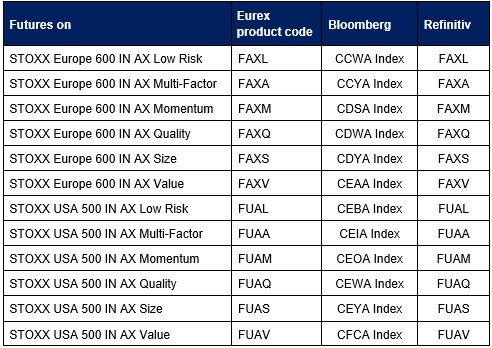 Please find below a table with the vendor codes from Bloomberg and Refinitiv for all STOXX® Industry Neutral Ax Factor Index Futures: