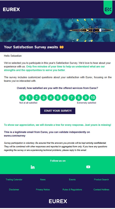 The invite has been sent from Eurex through our mailing tool. The sender address is “customer.survey@info.eurex.com”. The mail is personalized for each client.