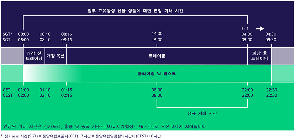 주의사항: 유렉스 고유동성 주가 지수 및 채권 선물들에 대해 거래 시간이 연장됨에 따라, 거래일 간 모든 주문은 홍콩/싱가포르 시간 (HKT/SGT) 오전 8시부터 입력되기 시작합니다. 모든 가격지정주문과 GTC 및 GTD 주문 역시 연장된 거래 시간 동안 가능하며, 이에 대한 취소 주문 역시 가능합니다.