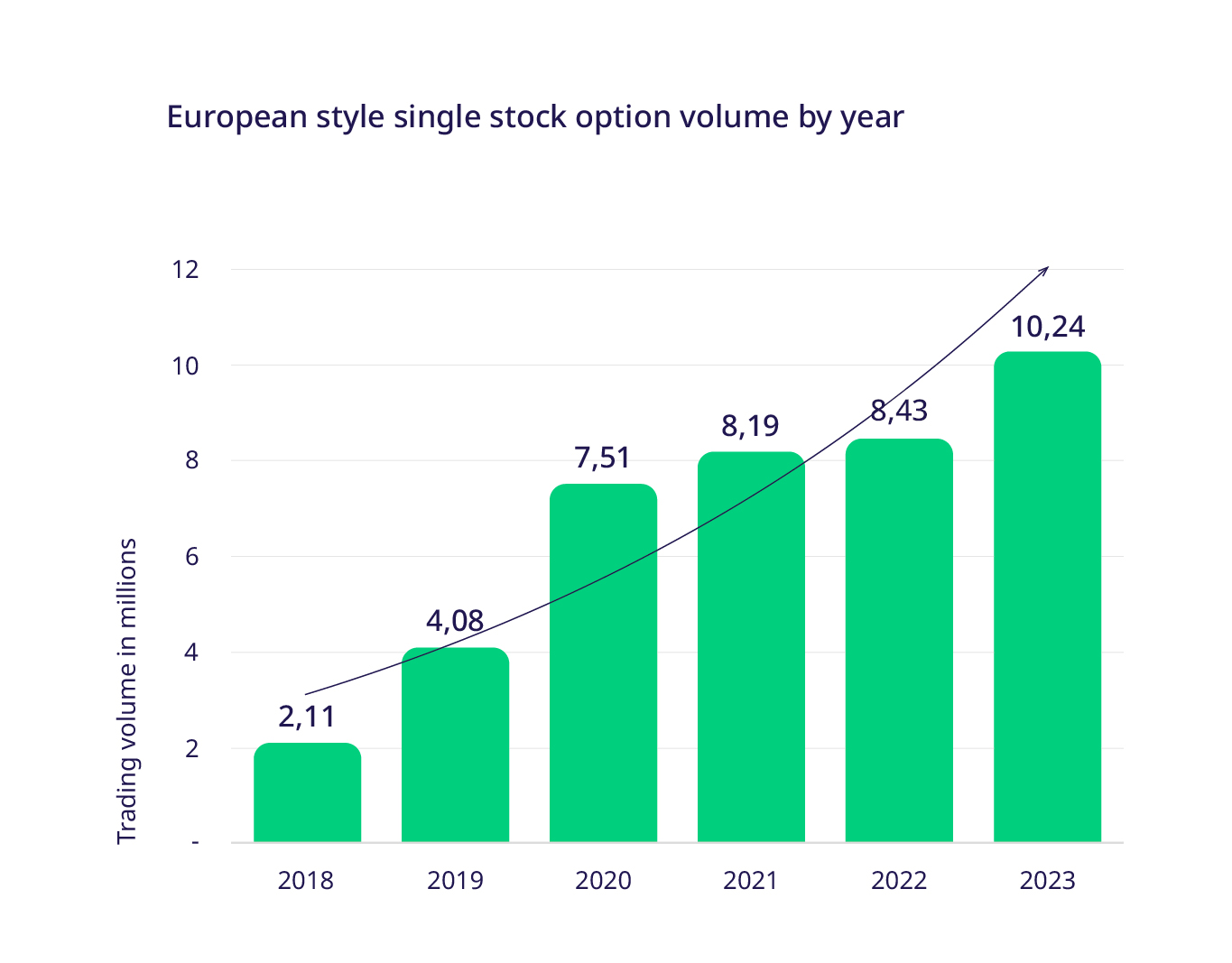 Eurex recently expanded the number of stocks with European style exercise to 119, about 20% of the equities with American-style options. These 119 stocks are the equities with the most active daily option volumes. Since 2018, volume in European style equity options has grown five-fold from 2 million to over 10 million in 2023 (Figure 1).