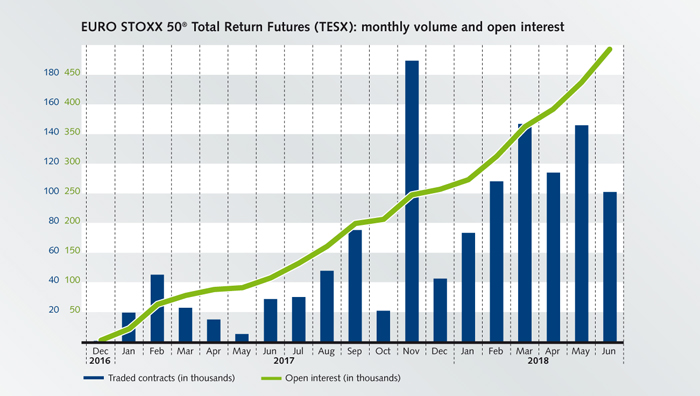 Open interest in Eurex’ Total Return Futures (TRF) has reached its highest peak to date at 496,000 contracts. This equals roughly EUR 17.0 billion. Average daily volume is now at 5,500 contracts (year-to-date), which translates to EUR 200 million.