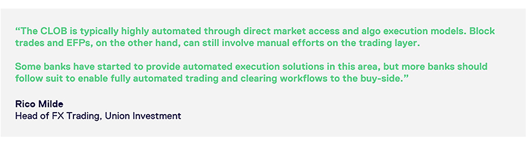 For larger futures positions for example, listed market participants often refer to block trades and EFPs. With FX desks increasingly involved in the brokerage of these trades, there has been a natural push towards low touch workflows that better align with OTC and CLOB execution.