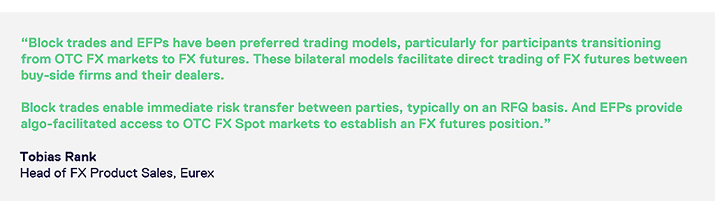 Block trades and Exchange for Physicals (EFPs) are key to the growing interlinkage between OTC and listed FX markets. They create a bridge for sizeable trades sourced in the OTC FX markets to access the efficiencies offered by clearing in listed FX markets. As such, most major FX desks within banks are establishing low touch execution services for FX futures blocks and EFPs.