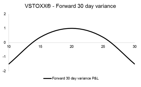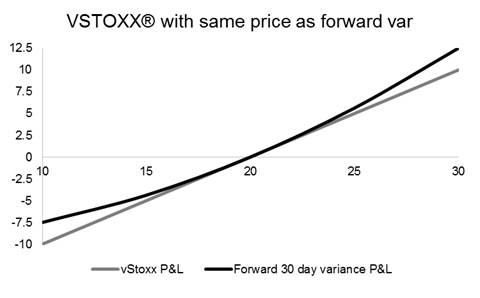 Volatility Futures tend to trade just below the levels of forward variance. If a Volatility Futures traded at the same level as forward variance an arbitrageur could simply go long forward variance and short Volatility Futures to construct a portfolio that can only earn profits. This can be seen by looking at the pay-out of a VSTOXX® Volatility Futures and a forward 30 day (to match VSTOXX®) variance swap for identical vega. We shall assume the strike of both the VSTOXX® and forward variance is 20. As vega gives the P&L sensitivity to volatility, having identical vega means the pay-out should be identical for small deviations of volatility about the level 20 (i.e. the gradient of the two lines are identical for volatility at 20). The diagram below shows the pay-out of forward variance is always equal to or above the pay-out of the VSTOXX® (if they are the same price), hence a long forward variance short VSTOXX® portfolio only has a positive pay-out.