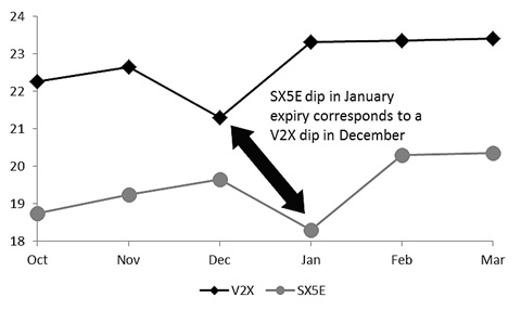 For example, the Volatility Futures for VSTOXX® December expiry should be compared with the SX5E January expiry the following year. This is because the December expiration of the VSTOXX® is based on what the VSTOXX® is on the (3rd or 4th Wednesday) Volatility Futures expiration in December. On the December Volatility Futures expiration, the VSTOXX® 30 day volatility is based on the index (3rd Friday) January expiry (of the following year) of the SX5E options. Due to the large number of public holidays between December and January expirations (Christmas and new year) the SX5E volatility term structure normally has a dip in January. Therefore VSTOXX® volatility term structure normally has a dip in December (due to the 1 month offset).