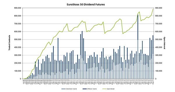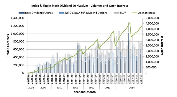 Overall, 6 million contracts in dividend derivatives have been traded on Eurex Exchange in 2015 so far. The open interest currently stands at 4.3 million contracts.