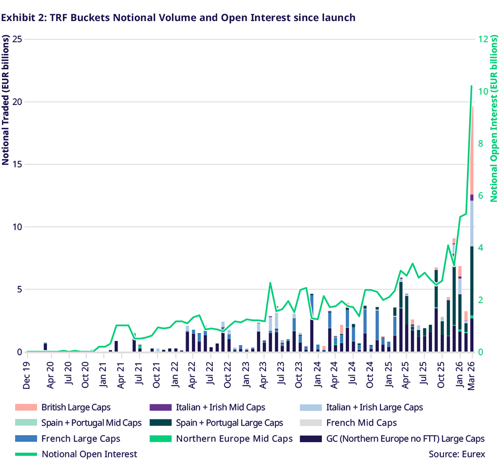 Overall, the Eurex ETRF/BTRF offering has a broad scope, with four currencies (EUR, GBX, CHF, and USD) across 465 ETRF products. This includes the February 2026 listing of 73 U.S. names based on the STOXX® USA 50 benchmark. Market interest in BTRFs has increased significantly: notional open interest across EUR‑denominated TRFs exceeded EUR 5 billion at the end of 2025, nearly doubling year‑on‑year (see Exhibit 2). Open interest across all ETRFs (including UK names) exceeded EUR 10 billion in notional terms as of March 2026. In Q1 2026 alone, record volumes were traded – nearly EUR 30 billion notional (+188% year‑on‑year), with over EUR 140 billion notional traded cumulatively since launch.
