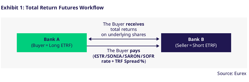 Equity Total Return Futures (ETRFs) are listed futures contracts used as building blocks for bespoke baskets (BTRFs) constructed by traders seeking to replicate an over‑the‑counter equity basket TRS, which is itself a substitute for a securities loan for short sales or margin borrowing for long positions. The buyer (long) receives the total returns on the underlying shares and pays a financing amount on the notional based on an agreed rate (see Exhibit 1). Alternatively, the buyer can take a short position to gain exposure to the opposite market direction.