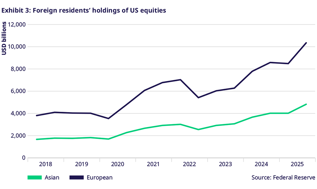 US equities hold a particularly strong attraction for global asset managers. Data from the Federal Reserve show that the dollar value of European holdings of US equities has risen sharply in recent years, driven by an equally strong surge in the US equity market (see Exhibit 3)1. European stock holdings are now above US$10 trillion and increased by 20% from 2024 to 2025. Asian investors have also increased their holdings, but more gradually in total dollar terms: they now hold just under USD 5 trillion, up from USD 4 trillion in the previous year.