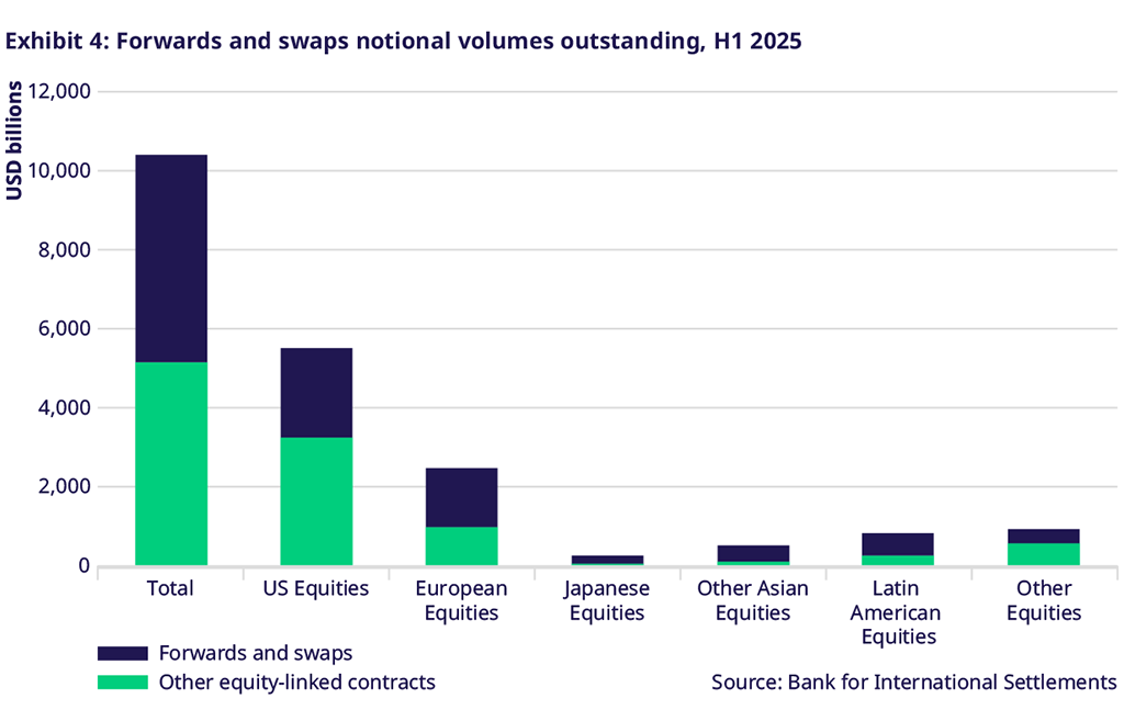 Leveraged trading strategies globally are likely to come into contact with the US derivatives market over time, whether for hedging existing positions or seeking leverage to support an investment thesis. The Bank for International Settlements (BIS) reports that forwards and swaps volumes for US equities totalled USD 2.2 trillion in the first half of 2025, significantly higher than the USD 1.5 trillion in European equities and USD 383 billion in Asian equities (see Exhibit 4)2. The US futures and swaps market is also larger than markets for other US equity‑linked contracts.