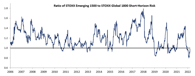 在俄罗斯入侵乌克兰后,新兴市场和发达市场之间的风险差距一直在缩小,因为新兴市场的风险增加得更快。