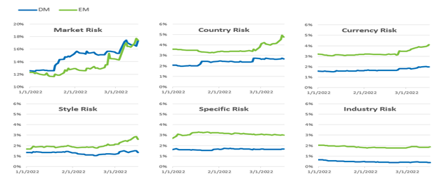 年初开始发达市场的市场系统风险一直高于新兴市场直到最近才改变。但新兴市场在所有其他风险因素上都高于发达市场。