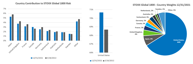 美国和加拿大对STOXX®全球1800股指的风险贡献度占比均有所下降。