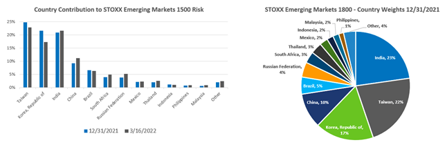 中国和印度对STOXX®新兴市场1500股指风险贡献度占比都在上升。