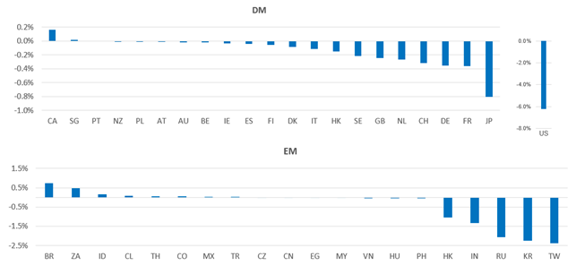 发达市场(DM)表现不如新兴市场(EM),而DM的总风险仍高于EM。